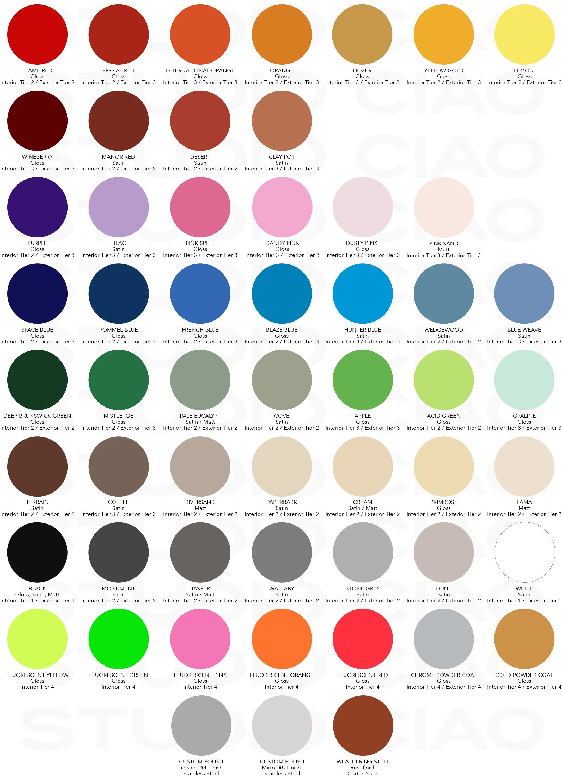 Tiered powder coat pricing structure listed below. Please refer to the below colour swatches as a guide only. High resolution swatches available for clients on request.
