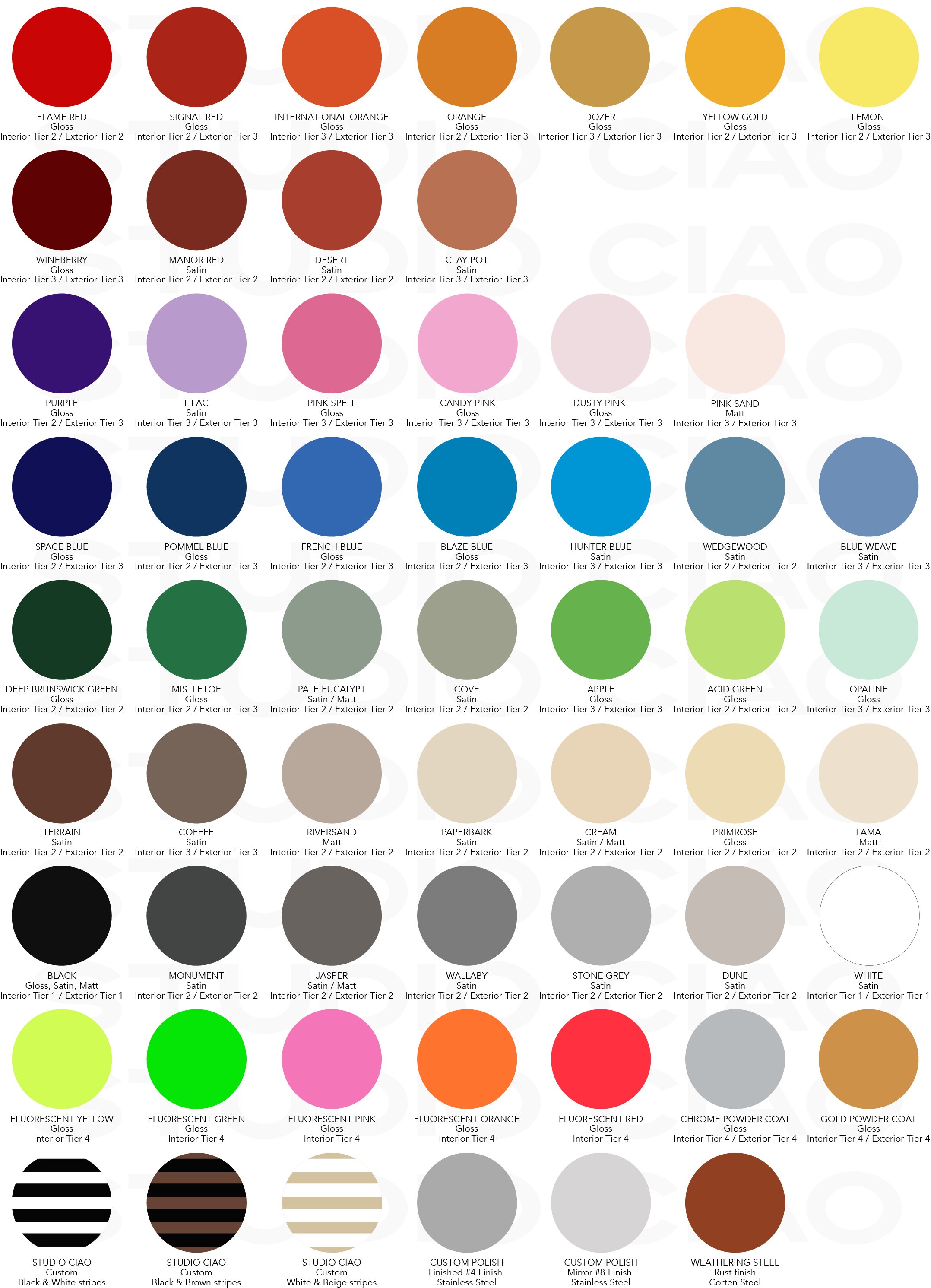 Tiered powder coat pricing structure listed below. Please refer to the below colour swatches as a guide only. High resolution swatches available for clients on request.